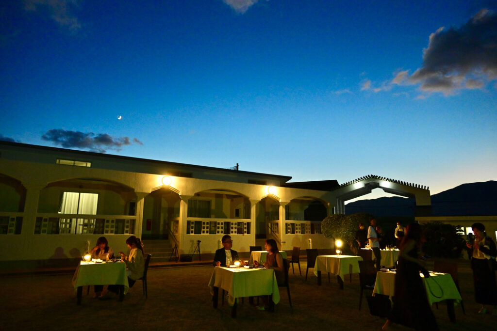 夕焼けのマジックアワーの空と共に始まり、満天の星に包まれるレストラン。